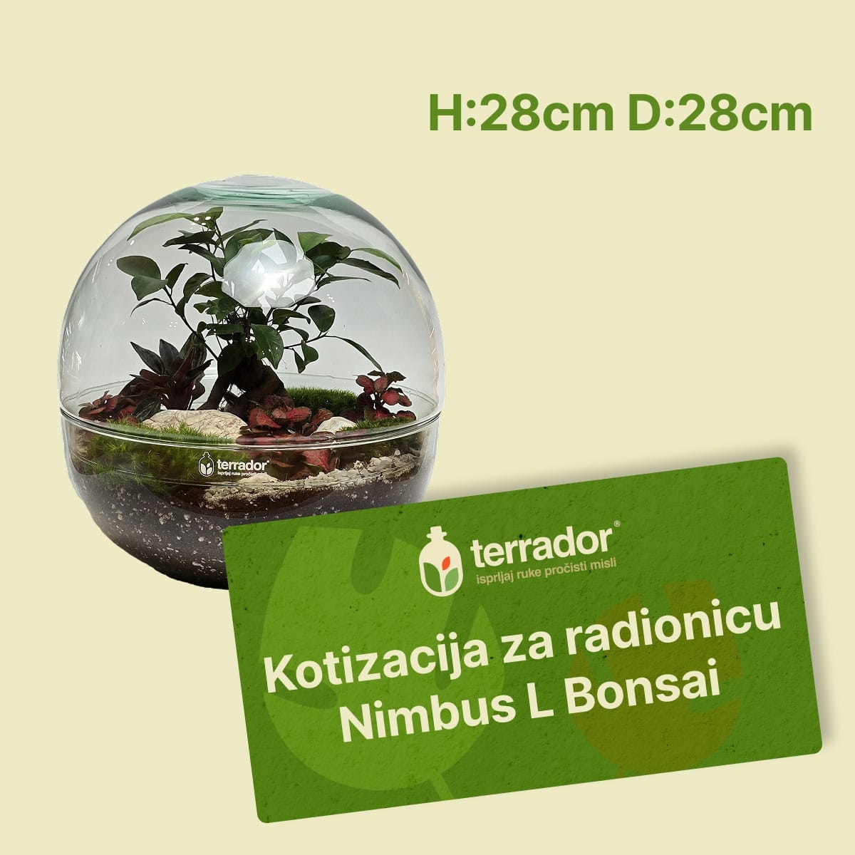 Pridruži nam se na jednoj od naših popularnih radionica za pravljenje terarijuma! Kotizacija ti obezbeđuje jednu radnu stanicu, sa posudom Nimbus L (28x28cm), bonsai Ficus Ginseng i svime što je potrebno za izradu jednog terarijuma. Uz kotizaciju dobijaš i piće dobrodošlice po izboru - vino, kafa, čaj, sok.