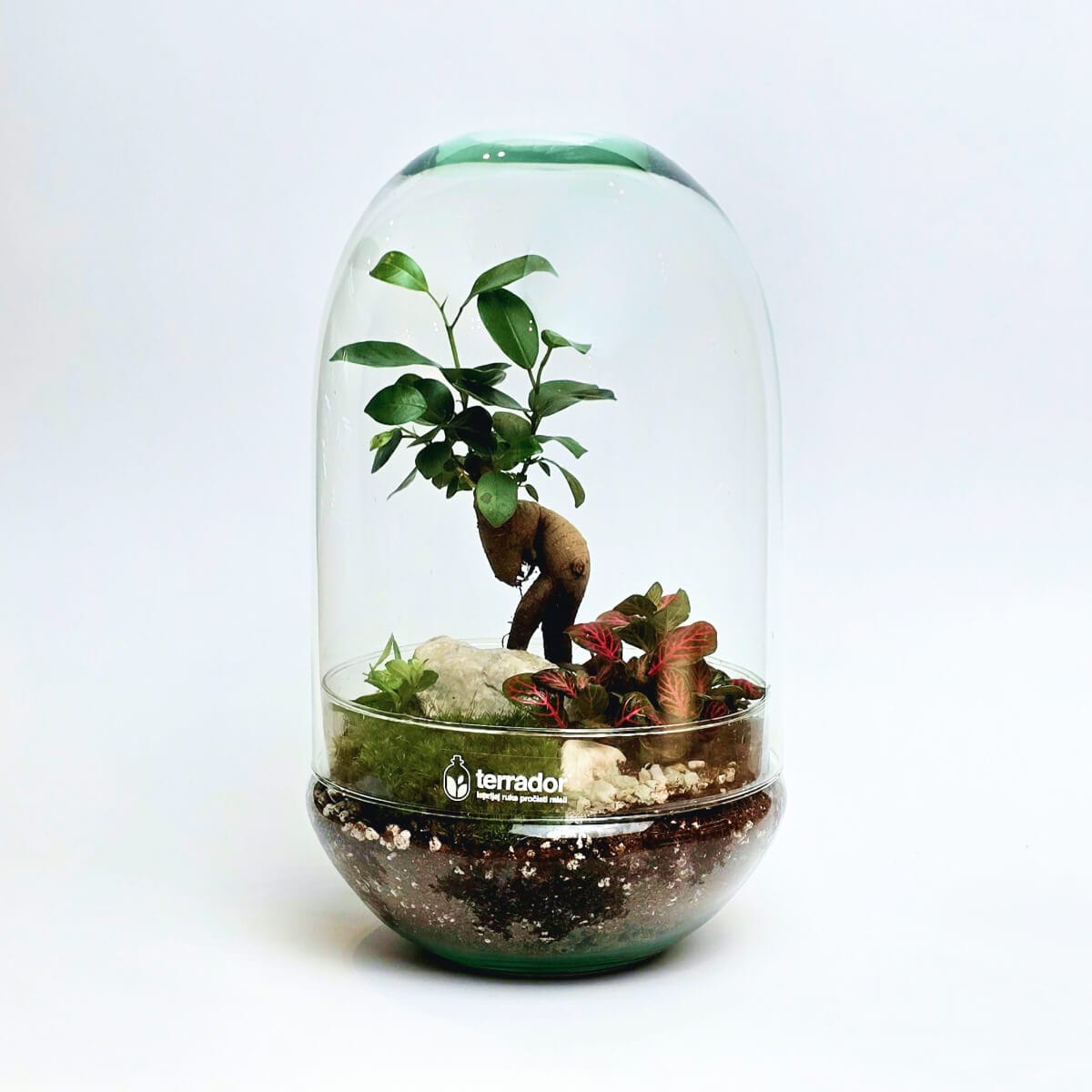 Lumen M Bonsai je luksuzni biljni terarijum srednje veličine, koji unosi eleganciju i prirodu u savršeno balansiranoj formi. Centralna biljka je bonsai drvce Ficus Ginseng, kao glavna tačka kompozicije na podlozi brižljivo odabranih mahovina i pratećih biljaka, koje zajedno pojačavaju osećaj skale.