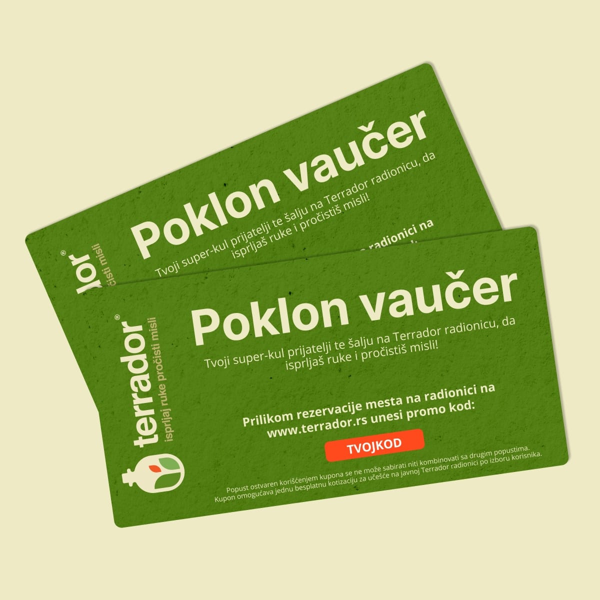 Jedinstveno iskustvo je najbolji poklon! Dragoj osobi možeš da podariš prisustvo na javnoj Terrador radionici tako što ćeš joj pokloniti vaučer za radionicu. Dobićeš vaučer u digitalnom formatu i uputstvo za upotrebu, što onda možeš sve da proslediš mejlom ili odštampaš.